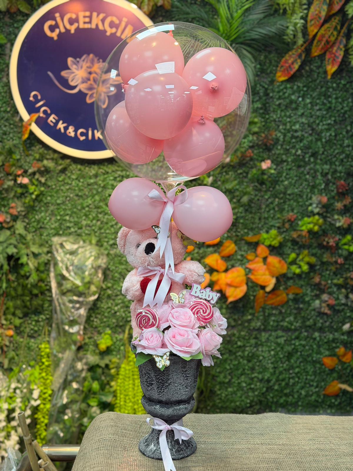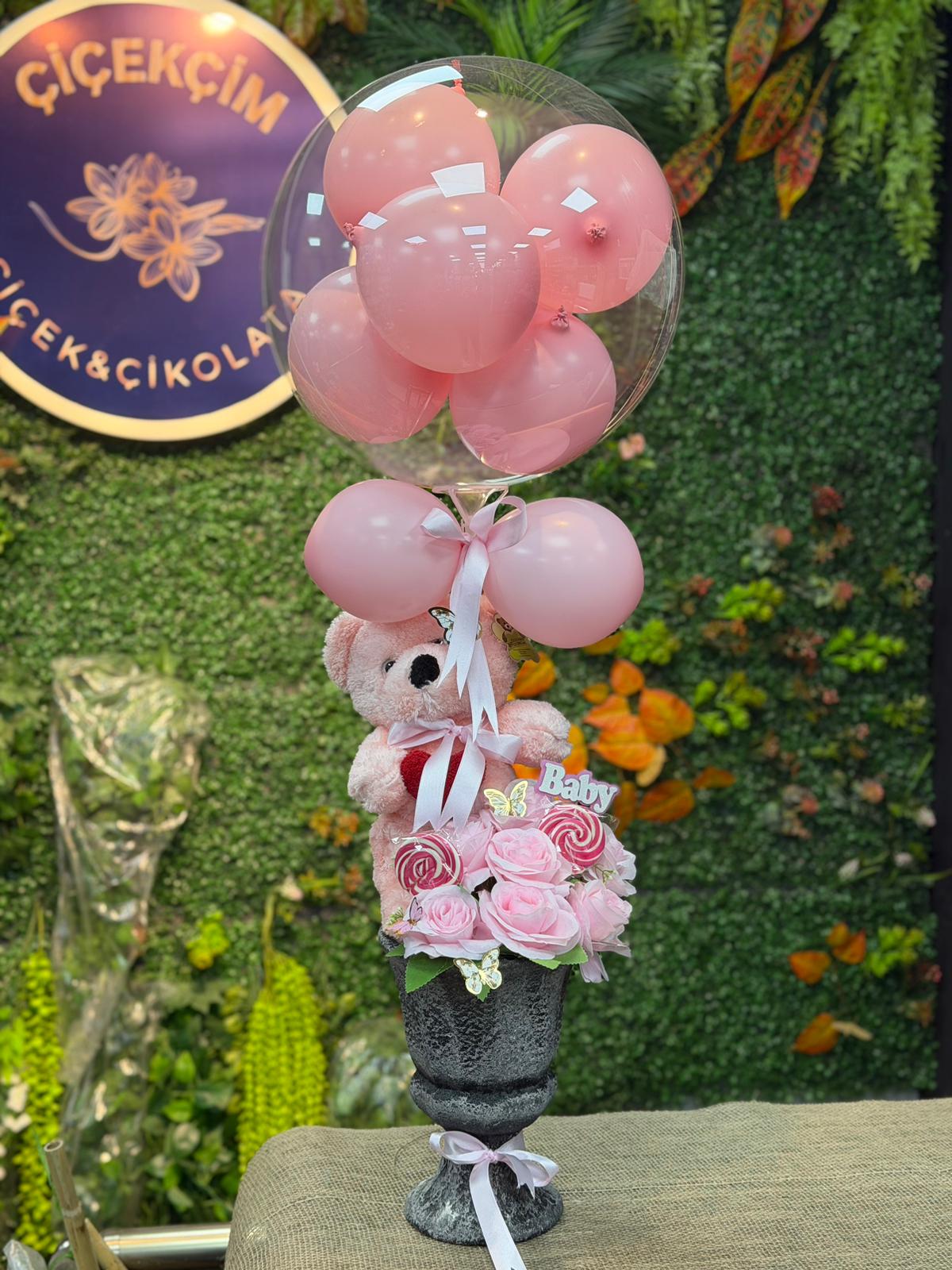 Özel Vazoda Pembe Ayıcıklı Balon
