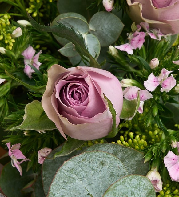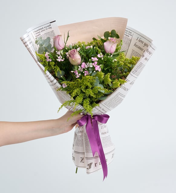 Pembe Gazete Bukette Hüsnüyusuf ve Lila Güller - 60020